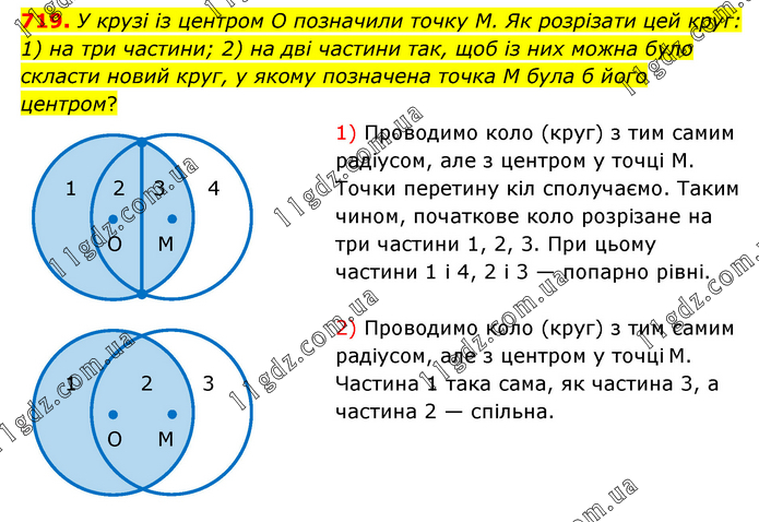 У крузі із центром O позначили точку М. Як розрізати цей круг: 1) на три частини; 2) на дві частини так, щоб із них можна було скласти новий круг, у якому позначена точка M була б його центром? 1) Проводимо коло (круг) з тим самим радіусом, але з центром у точці М. Точки перетину кіл сполучаємо. Таким чином, початкове коло розрізане на три частини 1, 2, 3. При цьому частини 1 і 4, 2 і 3 — попарно рівні. 2) Проводимо коло (круг) з тим самим радіусом, але з центром у точці М. Частина 1 така сама, як частина 3, а частина 2 — спільна.