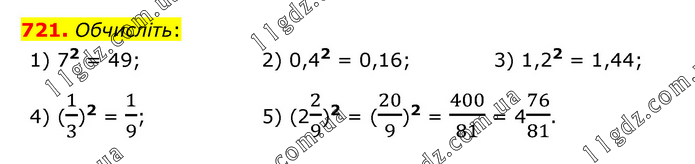 Обчисліть: 1) 72 = 49; 2) 0,42 = 0,16; 3) 1,22 = 1,44; 4) (1/3)2 = 1/9; 5) (22/9)2 = (20/9)2 = 400/81 = 476/81.