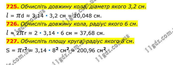 725. Обчисліть довжину кола, діаметр якого 3,2 см. l = πd ≈ 3,14 ∙ 3,2 см = 10,048 см. 726. Обчисліть довжину кола, радіус якого 6 см. l = 2πr ≈ 2 ∙ 3,14 ∙ 6 см = 37,68 см. 727. Обчисліть площу круга, радіус якого 8 см. S = πr2 ≈ 3,14 ∙ 82 см2 = 200,96 см2.