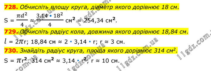 728. Обчисліть площу круга, діаметр якого дорівнює 18 см. S = (πd^2)/4 ≈ (3,14 • 18^2)/4 см2 = 254,34 см2. 729. Обчисліть радіус кола, довжина якого дорівнює 18,84 см. l = 2πr; 18,84 см ≈ 2 ∙ 3,14 ∙ r; r ≈ 3 см. 730. Знайдіть радіус круга, площа якого дорівнює 314 см2. S = πr2; 314 см2 ≈ 3,14 ∙ r2; r ≈ 10 см.