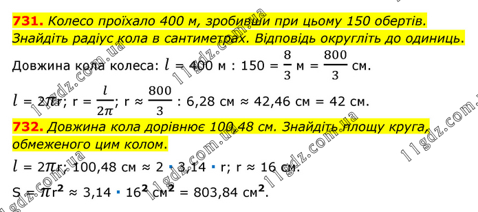 731. Колесо проїхало 400 м, зробивши при цьому 150 обертів. Знайдіть радіус кола в сантиметрах. Відповідь округліть до одиниць. Довжина кола колеса: l = 400 м : 150 = 8/3 м = 800/3 см. l = 2πr; r = l/2π; r ≈ 800/3 : 6,28 см ≈ 42,46 см = 42 см. 732. Довжина кола дорівнює 100,48 см. Знайдіть площу круга, обмеженого цим колом. l = 2πr; 100,48 см ≈ 2 ∙ 3,14 ∙ r; r ≈ 16 см. S = πr2 ≈ 3,14 ∙ 162 см2 = 803,84 см2.