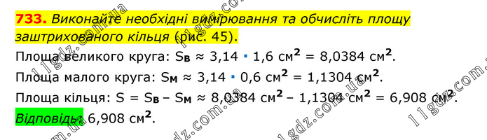 Виконайте необхідні вимірювання та обчисліть площу заштрихованого кільця (рис. 45). Площа великого круга: SB ≈ 3,14 ∙ 1,6 см2 = 8,0384 см2. Площа малого круга: SM ≈ 3,14 ∙ 0,6 см2 = 1,1304 см2. Площа кільця: S = SB – SM ≈ 8,0384 см2 – 1,1304 см2 = 6,908 см2. Відповідь: 6,908 см2.
