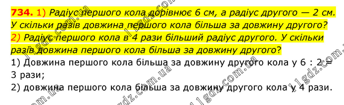1) Радіус першого кола дорівнює 6 см, а радіус другого — 2 см. У скільки разів довжина першого кола більша за довжину другого? 2) Радіус першого кола в 4 рази більший радіус другого. У скільки разів довжина першого кола більша за довжину другого? 1) Довжина першого кола більша за довжину другого кола у 6 : 2 = 3 рази; 2) довжина першого кола більша за довжину другого кола у 4 рази.