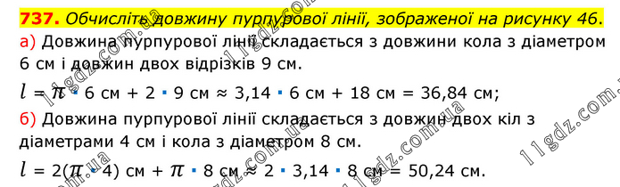 Обчисліть довжину пурпурової лінії, зображеної на рисунку 46. а) Довжина пурпурової лінії складається з довжини кола з діаметром 6 см і довжин двох відрізків 9 см. l = π ∙ 6 см + 2 ∙ 9 см ≈ 3,14 ∙ 6 см + 18 см = 36,84 см; б) Довжина пурпурової лінії складається з довжин двох кіл з діаметрами 4 см і кола з діаметром 8 см. l = 2(π ∙ 4) см + π ∙ 8 см ≈ 2 ∙ 3,14 ∙ 8 см = 50,24 см.
