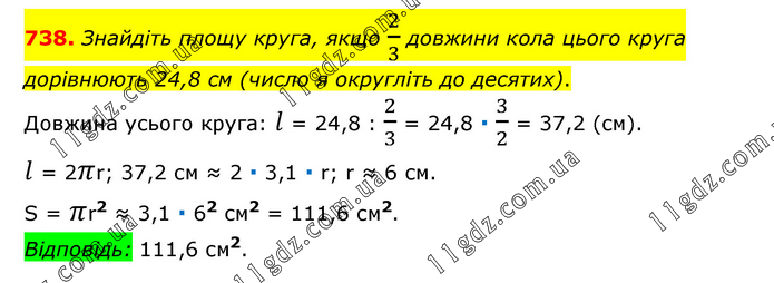 Знайдіть площу круга, якщо 2/3 довжини кола цього круга дорівнюють 24,8 см (число я округліть до десятих). Довжина усього круга: l = 24,8 : 2/3 = 24,8 ∙ 3/2 = 37,2 (см). l = 2πr; 37,2 см ≈ 2 ∙ 3,1 ∙ r; r ≈ 6 см. S = πr2 ≈ 3,1 ∙ 62 см2 = 111,6 см2. Відповідь: 111,6 см2.