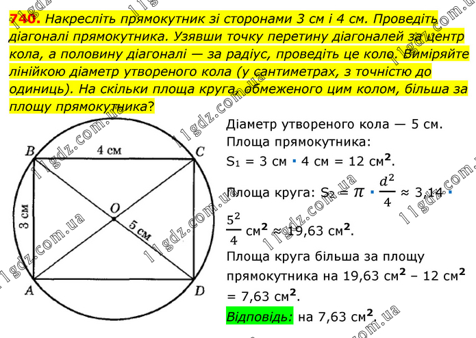 Накресліть прямокутник зі сторонами 3 см і 4 см. Проведіть діагоналі прямокутника. Узявши точку перетину діагоналей за центр кола, а половину діагоналі — за радіус, проведіть це коло. Виміряйте лінійкою діаметр утвореного кола (у сантиметрах, з точністю до одиниць). На скільки площа круга, обмеженого цим колом, більша за площу прямокутника? Діаметр утвореного кола — 5 см. Площа прямокутника: S1 = 3 см ∙ 4 см = 12 см2. Площа круга: S2 = π ∙ d^2/4 ≈ 3,14 ∙ 5^2/4 см2 ≈ 19,63 см2. Площа круга більша за площу прямокутника на 19,63 см2 – 12 см2 = 7,63 см2. Відповідь: на 7,63 см2.