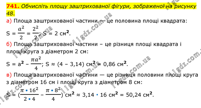 Обчисліть площу заштрихованої фігури, зображеної на рисунку 48. а) Площа заштрихованої частини — це половина площі квадрата: S = a^2/2 = 2^2/2; S = 2 см2. б) Площа заштрихованої частини – це різниця площі квадрата і площі круга з діаметром 2 см: S = a2 – (πa^2)/4; S ≈ (4 – 3,14) см2 = 0,86 см2. в) Площа заштрихованої частини — це різниця половини площі круга з діаметром 16 см і площі круга з діаметром 8 см: S = ((π • 16^2)/(2 • 4) – (π • 8^2)/4) см2 ≈ 3,14 ∙ 16 см2 = 50,24 см2.