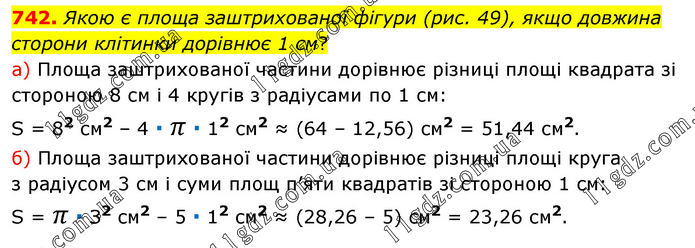 Якою є площа заштрихованої фігури (рис. 49), якщо довжина сторони клітинки дорівнює 1 см? а) Площа заштрихованої частини дорівнює різниці площі квадрата зі стороною 8 см і 4 кругів з радіусами по 1 см: S = 82 см2 – 4 ∙ π ∙ 12 см2 ≈ (64 – 12,56) см2 = 51,44 см2. б) Площа заштрихованої частини дорівнює різниці площі круга з радіусом 3 см і суми площ п’яти квадратів зі стороною 1 см: S = π ∙ З2 см2 – 5 ∙ 12 см2 ≈ (28,26 – 5) см2 = 23,26 см2.