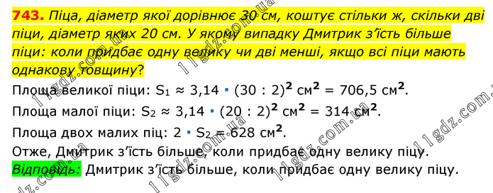 Піца, діаметр якої дорівнює 30 см, коштує стільки ж, скільки дві піци, діаметр яких 20 см. У якому випадку Дмитрик з’їсть більше піци: коли придбає одну велику чи дві менші, якщо всі піци мають однакову товщину? Площа великої піци: S1 ≈ 3,14 ∙ (30 : 2)2 см2 = 706,5 см2. Площа малої піци: S2 ≈ 3,14 ∙ (20 : 2)2 см2 = 314 см2. Площа двох малих піц: 2 ∙ S2 = 628 см2. Отже, Дмитрик з’їсть більше, коли придбає одну велику піцу. Відповідь: Дмитрик з’їсть більше, коли придбає одну велику піцу.
