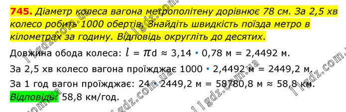 Діаметр колеса вагона метрополітену дорівнює 78 см. За 2,5 хв колесо робить 1000 обертів. Знайдіть швидкість поїзда метро в кілометрах за годину. Відповідь округліть до десятих. Довжина обода колеса: l = πd ≈ 3,14 ∙ 0,78 м = 2,4492 м. За 2,5 хв колесо вагона проїжджає 1000 ∙ 2,4492 м = 2449,2 м. За 1 год вагон проїжджає: 24 ∙ 2449,2 м = 58780,8 м ≈ 58,8 км. Відповідь: 58,8 км/год.