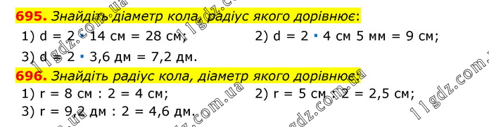 695. Знайдіть діаметр кола, радіус якого дорівнює: 1) d = 2 ∙ 14 см = 28 см; 2) d = 2 ∙ 4 см 5 мм = 9 см; 3) d = 2 ∙ 3,6 дм = 7,2 дм. 696. Знайдіть радіус кола, діаметр якого дорівнює: 1) r = 8 см : 2 = 4 см; 2) r = 5 см : 2 = 2,5 см; 3) r = 9,2 дм : 2 = 4,6 дм.