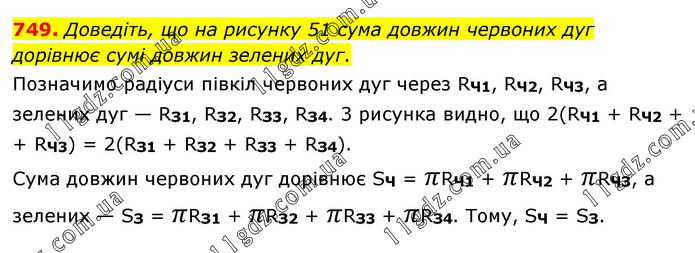 Доведіть, що на рисунку 51 сума довжин червоних дуг дорівнює сумі довжин зелених дуг. Позначимо радіуси півкіл червоних дуг через RЧ1, RЧ2, RЧ3, а зелених дуг — RЗ1, RЗ2, RЗ3, RЗ4. 3 рисунка видно, що 2(RЧ1 + RЧ2 + + RЧ3) = 2(RЗ1 + RЗ2 + RЗ3 + RЗ4). Сума довжин червоних дуг дорівнює SЧ = πRЧ1 + πRЧ2 + πRЧ3, а зелених — SЗ = πRЗ1 + πRЗ2 + πRЗ3 + πRЗ4. Тому, SЧ = SЗ.