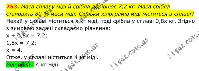 Маса сплаву міді й срібла дорівнює 7,2 кг. Маса срібла становить 80 % маси міді. Скільки кілограмів міді міститься в сплаві? Нехай у сплаві міститься х кг міді, тоді срібла у сплаві 0,8х кг. Згідно з зимовою задачі складаємо рівняння: х + 0,8x = 7,2; 1,8x = 7,2; х = 4. Отже, у сплаві міститься 4 кг міді. Відповідь: 4 кг міді.