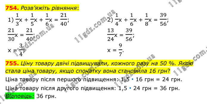 754. Розв’яжіть рівняння: 1) 1/3x + 1/5x + 1/6х = 21/40; 21/30х = 21/40; х = 3/4; 2) 1/4х + 1/6х + 1/8х = 39/56; 13/24х = 39/56; х = 9/7. 755. Ціну товару двічі підвищували, кожного разу на 50 %. Якою стала ціна товару, якщо спочатку вона становила 16 грн? Ціна товару після першого підвищення: 1,5 ∙ 16 грн = 24 грн. Ціна товару після другого підвищення: 1,5 ∙ 24 грн = 36 грн. Відповідь: 36 грн.