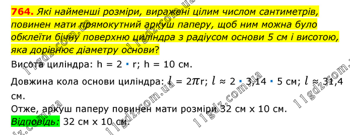 Які найменші розміри, виражені цілим числом сантиметрів, повинен мати прямокутний аркуш паперу, щоб ним можна було обклеїти бічну поверхню циліндра з радіусом основи 5 см і висотою, яка дорівнює діаметру основи? Висота циліндра: h = 2 ∙ r; h = 10 см. Довжина кола основи циліндра: l = 2πr; l ≈ 2 ∙ 3,14 ∙ 5 см; l ≈ 31,4 см. Отже, аркуш паперу повинен мати розміри 32 см x 10 см. Відповідь: 32 см x 10 см.