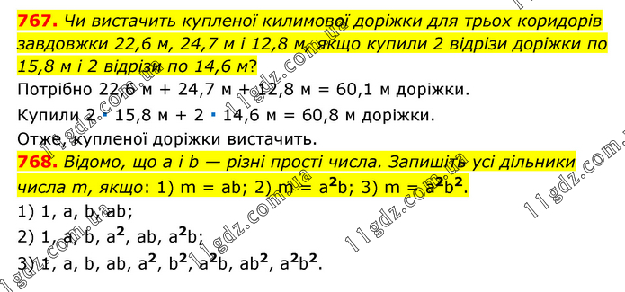 767. Чи вистачить купленої килимової доріжки для трьох коридорів завдовжки 22,6 м, 24,7 м і 12,8 м, якщо купили 2 відрізи доріжки по 15,8 м і 2 відрізи по 14,6 м? Потрібно 22,6 м + 24,7 м + 12,8 м = 60,1 м доріжки. Купили 2 ∙ 15,8 м + 2 ∙ 14,6 м = 60,8 м доріжки. Отже, купленої доріжки вистачить. 768. Відомо, що а і b — різні прості числа. Запишіть усі дільники числа m, якщо: 1) m = ab; 2) m = а2b; 3) m = а2b2. 1) 1, а, b, аb; 2) 1, а, b, а2, аb, а2b; 3) 1, а, b, аb, а2, b2, а2b, аb2, а2b2.
