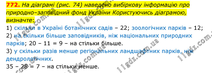 На діаграмі (рис. 74) наведено вибіркову інформацію про природно–заповідний фонд України Користуючись діаграмою, визначте: 1) скільки в Україні ботанічних садів – 22; зоологічних парків – 12; 2) на скільки більше заповідників, ніж національних природних парків; 20 – 11 = 9 – на стільки більше. 3) у скільки разів менше регіональних ландшафтних парків, ніж дендрологічних. 35 – 28 = 7 – на стільки менше.