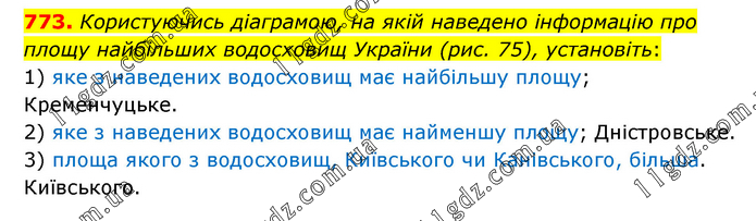 Користуючись діаграмою, на якій наведено інформацію про площу найбільших водосховищ України (рис. 75), установіть: 1) яке з наведених водосховищ має найбільшу площу; Кременчуцьке. 2) яке з наведених водосховищ має найменшу площу; Дністровське. 3) площа якого з водосховищ, Київського чи Канівського, більша. Київського.