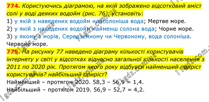 774. Користуючись діаграмою, на якій зображено відсотковий вміст солі у воді деяких водойм (рис. 76), установіть: 1) у якій з наведених водойм найсолоніша вода; Мертве море. 2) у якій з наведених водойм найменш солона вода; Чорне море. 3) у якому з морів, Середземному чи Червоному, вода солоніша. Червоне море. 775. На рисунку 77 наведено діаграму кількості користувачів інтернету у світі у відсотках відносно загальної кількості населення з 2011 по 2020 рік. Протягом якого року відбувся найменший приріст користувачів? найбільший приріст? Найменший – протягом 2020. 58,3 – 56,9 = 1,4. Найбільший – протягом 2019. 56,9 – 52,7 = 4,2.