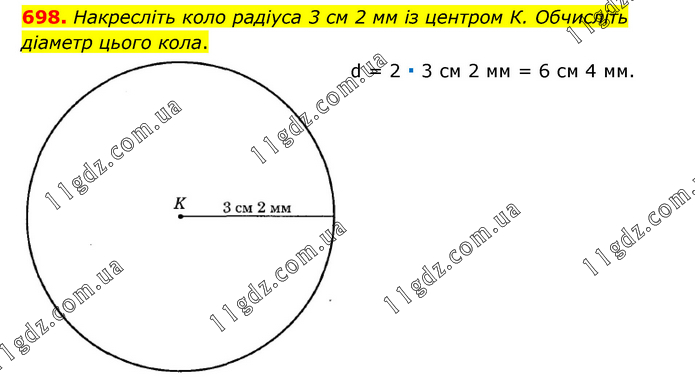 Накресліть коло радіуса 3 см 2 мм із центром К. Обчисліть діаметр цього кола. d = 2 ∙ 3 см 2 мм = 6 см 4 мм.