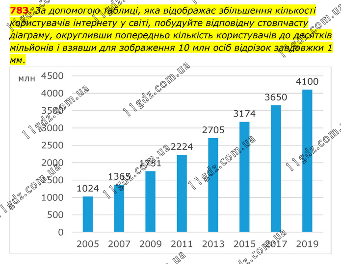За допомогою таблиці, яка відображає збільшення кількості користувачів інтернету у світі, побудуйте відповідну стовпчасту діаграму, округливши попередньо кількість користувачів до десятків мільйонів і взявши для зображення 10 млн осіб відрізок завдовжки 1 мм.