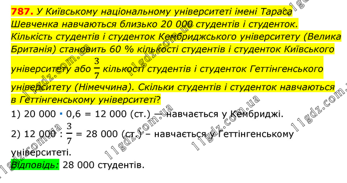У Київському національному університеті імені Тараса Шевченка навчаються близько 20 000 студентів і студенток. Кількість студентів і студенток Кембриджського університету (Велика Британія) становить 60 % кількості студентів і студенток Київського університету або 3/7 кількості студентів і студенток Геттінгенського університету (Німеччина). Скільки студентів і студенток навчаються в Геттінгенському університеті? 1) 20 000 ∙ 0,6 = 12 000 (ст.) — навчається у Кембриджі. 2) 12 000 : 3/7 = 28 000 (ст.) – навчається у Геттінгенському університеті. Відповідь: 28 000 студентів.