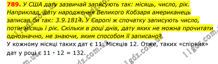 У США дату зазвичай записують так: місяць, число, рік. Наприклад, дату народження Великого Кобзаря американець записав би так: 3.9.1814. У Європі ж спочатку записують число, потім місяць і рік. Скільки в році днів, дату яких не можна прочитати однозначно, не знаючи, яким способом її записано? У кожному місяці таких дат є 11. Місяців 12. Отже, таких «спірних» дат у році є 11 ∙ 12 = 132.