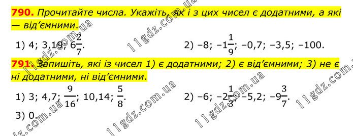 790. Прочитайте числа. Укажіть, як і з цих чисел є додатними, а які — від’ємними. 1) 4; 3,19; 62/7. 2) –8; –11/9; –0,7; –3,5; –100. 791. Запишіть, які із чисел 1) є додатними; 2) є від’ємними; 3) не є ні додатними, ні від’ємними. 1) 3; 4,7; 9/16; 10,14; 5/8. 2) –6; –21/3; –5,2; –93/7. 3) 0.