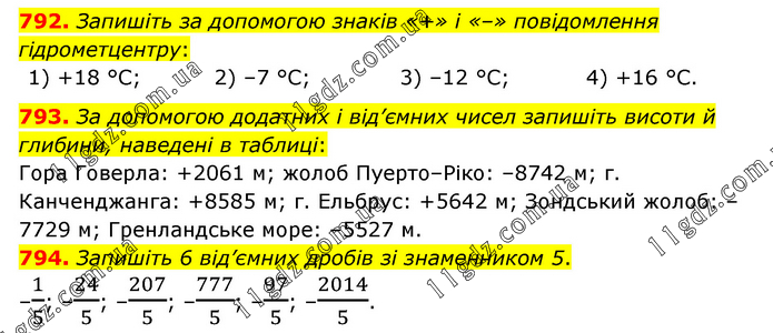 792. Запишіть за допомогою знаків «+» і «–» повідомлення гідрометцентру: 1) +18 °C; 2) –7 °C; 3) –12 °C; 4) +16 °C. 793. За допомогою додатних і від’ємних чисел запишіть висоти й глибини, наведені в таблиці: Гора Говерла: +2061 м; жолоб Пуерто–Ріко: –8742 м; г. Канченджанга: +8585 м; г. Ельбрус: +5642 м; Зондський жолоб: –7729 м; Гренландське море: –5527 м. 794. Запишіть 6 від’ємних дробів зі знаменником 5. –1/5; –24/5; –207/5; –777/5; –97/5; –2014/5.