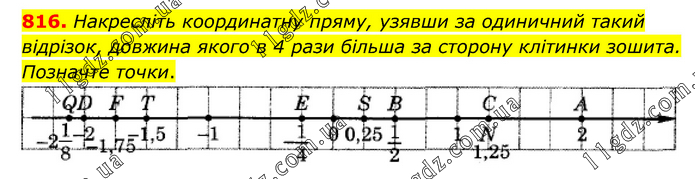 Накресліть координатну пряму, узявши за одиничний такий відрізок, довжина якого в 4 рази більша за сторону клітинки зошита. Позначте точки.