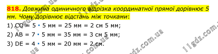 Довжина одиничного відрізка координатної прямої дорівнює 5 мм. Чому дорівнює відстань між точками: 1) СО = 5 ∙ 5 мм = 25 мм = 2 см 5 мм; 2) AB = 7 ∙ 5 мм = 35 мм = 3 см 5 мм; 3) DE = 4 ∙ 5 мм = 20 мм = 2 см.