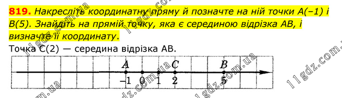 Накресліть координатну пряму й позначте на ній точки А(–1) і В(5). Знайдіть на прямій точку, яка є серединою відрізка AB, і визначте її координату. Точка С(2) — середина відрізка AB.