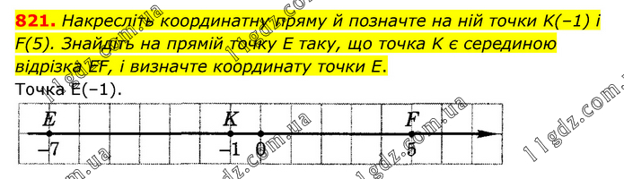 Накресліть координатну пряму й позначте на ній точки K(–1) і F(5). Знайдіть на прямій точку E таку, що точка K є серединою відрізка EF, і визначте координату точки Е. Точка Е(–1).