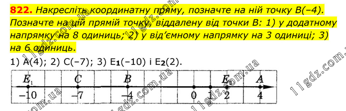 Накресліть координатну пряму, позначте на ній точку В(–4). Позначте на цій прямій точку, віддалену від точки В: 1) у додатному напрямку на 8 одиниць; 2) у від’ємному напрямку на 3 одиниці; 3) на 6 одиниць. 1) А(4); 2) С(–7); 3) Е1(–10) i Е2(2).