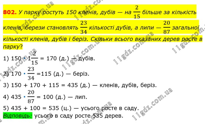 У парку ростуть 150 кленів, дубів — на 2/15 більше за кількість кленів, берези становлять 23/34 кількості дубів, а липи — 20/87 загальної кількості кленів, дубів і беріз. Скільки всього вказаних дерев росте в парку? 1) 150 ∙ 12/15 = 170 (д.) — дубів. 2) 170 ∙ 23/34 =115 (д.) — беріз. 3) 150 + 170 + 115 = 435 (д.) — кленів, дубів, беріз. 4) 435 ∙ 20/87 = 100 (д.) — лип. 5) 435 + 100 = 535 (ц.) — усього росте в саду. Відповідь: усього в саду росте 535 дерев.