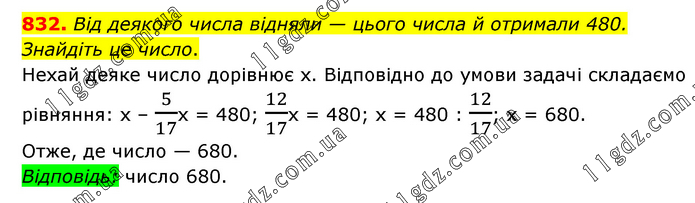 Від деякого числа відняли — цього числа й отримали 480. Знайдіть це число. Нехай деяке число дорівнює х. Відповідно до умови задачі складаємо рівняння: х – 5/17x = 480; 12/17x = 480; х = 480 : 12/17; х = 680. Отже, де число — 680. Відповідь: число 680.