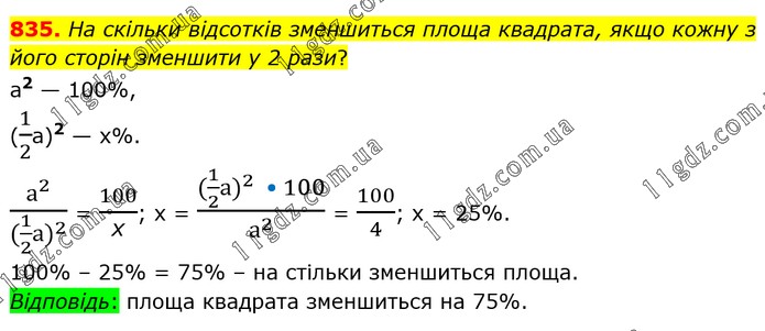 На скільки відсотків зменшиться площа квадрата, якщо кожну з його сторін зменшити у 2 рази? а2 — 100%, (1/2а)2 — х%. а^2/((1/2 〖а)〗^2 ) = 100/х; х = ((1/2 〖а)〗^2 • 100)/а^2 = 100/4; х = 25%. 100% – 25% = 75% – на стільки зменшиться площа. Відповідь: площа квадрата зменшиться на 75%.
