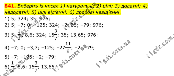 Виберіть із чисел 1) натуральні; 2) цілі; 3) додатні; 4) недодатні; 5) цілі від’ємні; 6) дробові невід’ємні. 1) 5; 324; 35; 976; 2) 5; –7; 0; –125; 324; –2; 35; –79; 976; 3) 5; 1/2; 8,6; 324; 153/7; 35; 13,65; 976; 4) –7; 0; –3,7; –125; –2711/9; –2; –79; 5) –7; –125; –2; –79; 6) 1/2; 8,6; 153/7; 13,65.