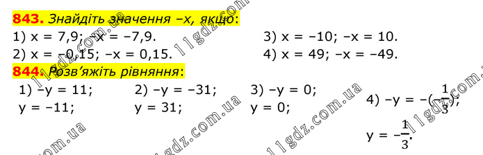 843. Знайдіть значення –х, якщо: 1) х = 7,9; –х = –7,9. 2) х = –0,15; –х = 0,15. 3) х = –10; –х = 10. 4) х = 49; –х = –49. 844. Розв’яжіть рівняння: 1) –у = 11; у = –11; 2) –у = –31; у = 31; 3) –у = 0; у = 0; 4) –у = –(–1/3); у = –1/3.