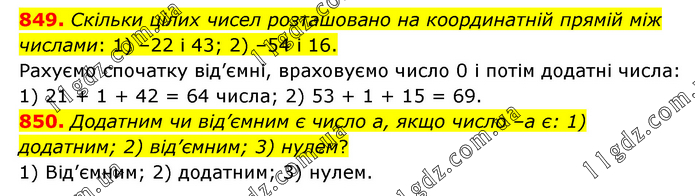 849. Скільки цілих чисел розташовано на координатній прямій між числами: 1) –22 і 43; 2) –54 і 16. Рахуємо спочатку від’ємні, враховуємо число 0 і потім додатні числа: 1) 21 + 1 + 42 = 64 числа; 2) 53 + 1 + 15 = 69. 850. Додатним чи від’ємним є число а, якщо число –а є: 1) додатним; 2) від’ємним; 3) нулем? 1) Від’ємним; 2) додатним; 3) нулем.