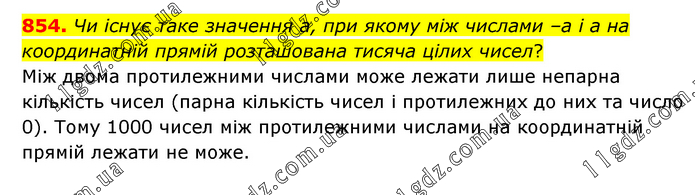 Чи існує таке значення а, при якому між числами –а і а на координатній прямій розташована тисяча цілих чисел? Між двома протилежними числами може лежати лише непарна кількість чисел (парна кількість чисел і протилежних до них та число 0). Тому 1000 чисел між протилежними числами на координатній прямій лежати не може.
