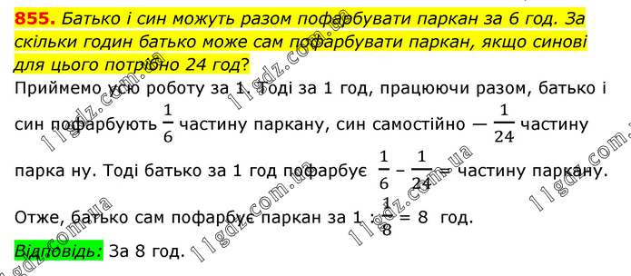 Батько і син можуть разом пофарбувати паркан за 6 год. За скільки годин батько може сам пофарбувати паркан, якщо синові для цього потрібно 24 год? Приймемо усю роботу за 1. Тоді за 1 год, працюючи разом, батько і син пофарбують 1/6 частину паркану, син самостійно — 1/24 частину парка ну. Тоді батько за 1 год пофарбує 1/6 – 1/24 = частину паркану. Отже, батько сам пофарбує паркан за 1 : 1/8 = 8 год. Відповідь: За 8 год.