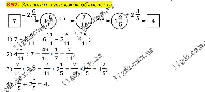 Заповніть ланцюжок обчислень: 1) 7 – 26/11 = 611/11 – 26/11 = 45/11; 2) 45/11 : 7 = 49/11 ∙ 1/7 = 7/11; 3) 7/11 ∙ 2,2 = 7/11 ∙ 21/5 = 7/11 ∙ 11/5 = 12/5; 4) 12/5 + 23/5 = 4.