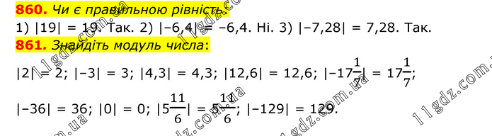 860. Чи є правильною рівність: 1) |19| = 19. Так. 2) |–6,4| = –6,4. Ні. 3) |–7,28| = 7,28. Так. 861. Знайдіть модуль числа: |2| = 2; |–3| = 3; |4,3| = 4,3; |12,6| = 12,6; |–171/7| = 171/7; |–36| = 36; |0| = 0; |511/6| = 511/6; |–129| = 129.