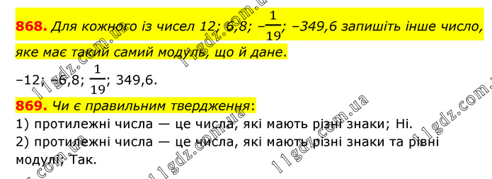 868. Для кожного із чисел 12; 6,8; –1/19; –349,6 запишіть інше число, яке має такий самий модуль, що й дане. –12; –6,8; 1/19; 349,6. 869. Чи є правильним твердження: 1) протилежні числа — це числа, які мають різні знаки; Ні. 2) протилежні числа — це числа, які мають різні знаки та рівні модулі; Так.