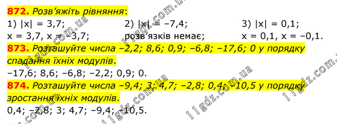 872. Розв’яжіть рівняння: 1) |х| = 3,7; х = 3,7, х = –3,7; 2) |х| = –7,4; розв’язків немає; 3) |х| = 0,1; х = 0,1, х = –0,1. 873. Розташуйте числа –2,2; 8,6; 0,9; –6,8; –17,6; 0 у порядку спадання їхніх модулів. –17,6; 8,6; –6,8; –2,2; 0,9; 0. 874. Розташуйте числа –9,4; 3; 4,7; –2,8; 0,4; –10,5 у порядку зростання їхніх модулів. 0,4; –2,8; 3; 4,7; –9,4; –10,5.