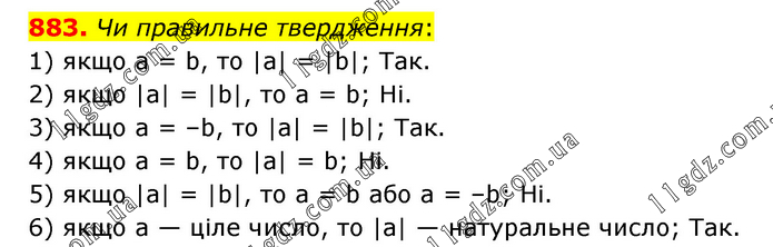 Чи правильне твердження: 1) якщо а = b, то |а| = |b|; Так. 2) якщо |а| = |b|, то а = b; Ні. 3) якщо а = –b, то |а| = |b|; Так. 4) якщо а = b, то |а| = b; Ні. 5) якщо |а| = |b|, то а = b або а = –b; Ні. 6) якщо а — ціле число, то |а| — натуральне число; Так.