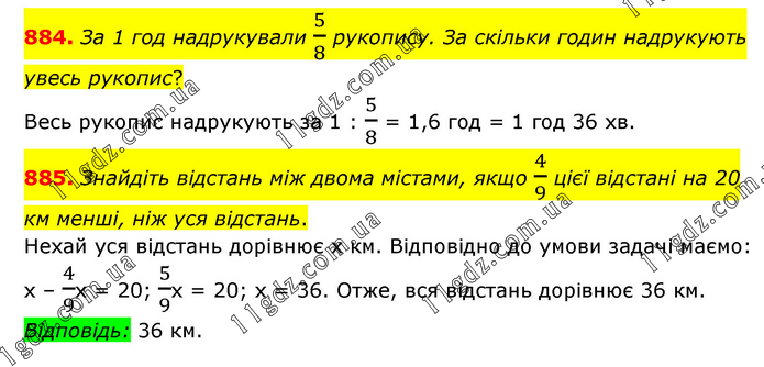 884. За 1 год надрукували 5/8 рукопису. За скільки годин надрукують увесь рукопис? Весь рукопис надрукують за 1 : 5/8 = 1,6 год = 1 год 36 хв. 885. Знайдіть відстань між двома містами, якщо 4/9 цієї відстані на 20 км менші, ніж уся відстань. Нехай уся відстань дорівнює х км. Відповідно до умови задачі маємо: х – 4/9х = 20; 5/9х = 20; х = 36. Отже, вся відстань дорівнює 36 км. Відповідь: 36 км.