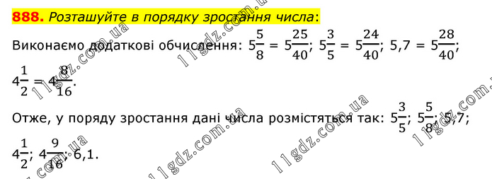 Розташуйте в порядку зростання числа: Виконаємо додаткові обчислення: 55/8 = 525/40; 53/5 = 524/40; 5,7 = 528/40; 41/2 = 48/16. Отже, у поряду зростання дані числа розмістяться так: 53/5; 55/8; 5,7; 41/2; 49/16; 6,1.
