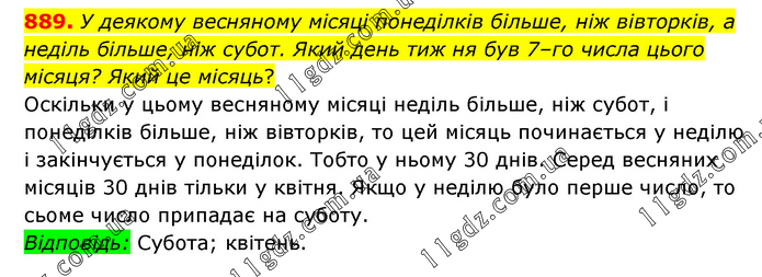 У деякому весняному місяці понеділків більше, ніж вівторків, а неділь більше, ніж субот. Який день тиж ня був 7–го числа цього місяця? Який це місяць? Оскільки у цьому весняному місяці неділь більше, ніж субот, і понеділків більше, ніж вівторків, то цей місяць починається у неділю і закінчується у понеділок. Тобто у ньому 30 днів. Серед весняних місяців 30 днів тільки у квітня. Якщо у неділю було перше число, то сьоме число припадає на суботу. Відповідь: Субота; квітень.